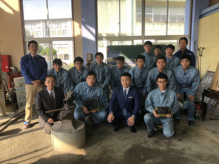 11月14日(火)に、機械科3年生の鍛造班10名が製作した「舟釘」100本の贈呈式を、球磨川くだり「HASSENBA」にて行いました。
