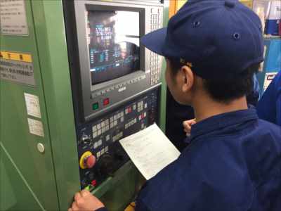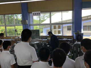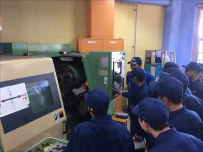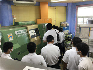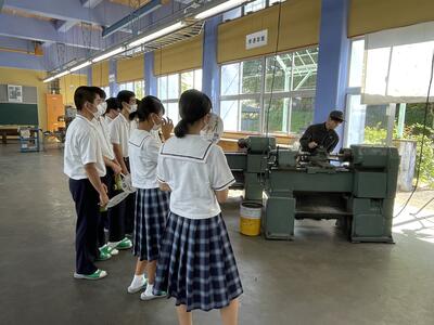 入学して2ヶ月の1年生は初めて見る旋盤作業に釘付けです!