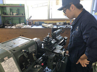 赤池くんを発見!旋盤の練習していました