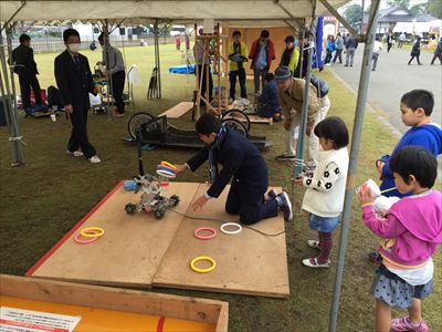 ロボット班は輪投げロボットや今年の全国高校ロボット競技大会に出場したロボットで子供たちに楽しんでもらい、ものづくりの楽しさを実感してもらいました。
