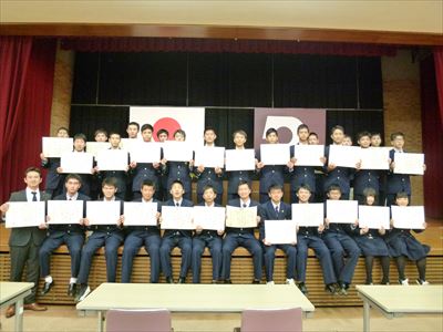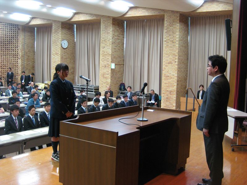 今回は、3級機械検査の代表で機械科3年B組の山北愛友さんが登壇し、立派な態度で代表挨拶を行いました。写真はその時の様子です。なお、平成28年度の後期技能検定において、機械科生徒計75名が合格し、「技能士」の称号を得ました。また、技能士合格者数が、県内で最も多いということで、球磨工業高校が団体表彰も受けました。今後も技術や技能をたくさん身につけ、日本の産業界を牽引していってほしいものです。