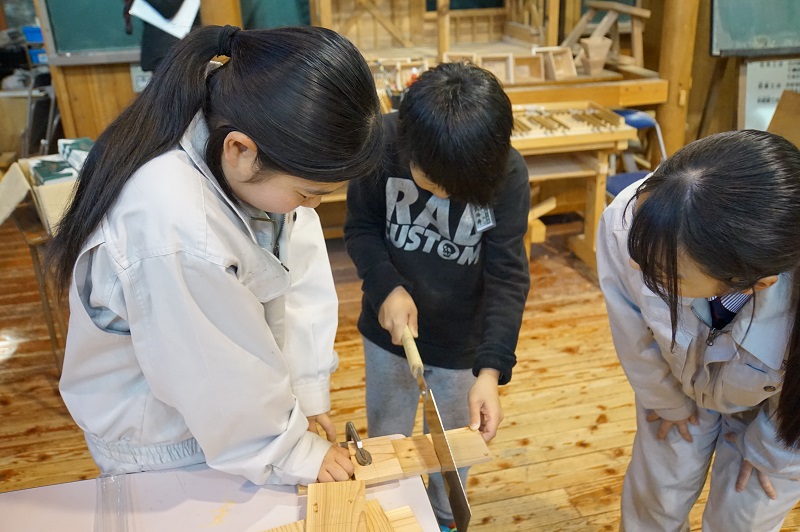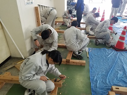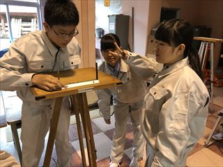 まずは、建築科の概要説明、課題研究の作業の様子を見学しました。そのあと、鉋掛け、鋸引き、鑿打ちなどの体験をして、最後にイーゼルを制作しました。