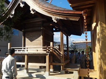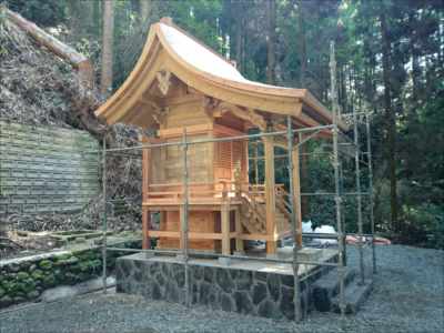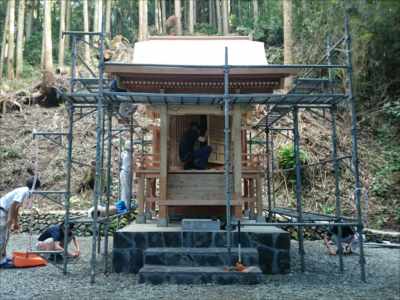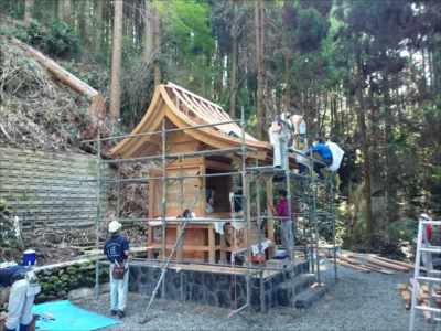 南小国白川地区天満宮本殿の改修工事4日目です。昨日何とか予定どおり野垂木取り付けを終了して、本日も6時から作業に取りかかっております。ようやく終わりが見えてきました。