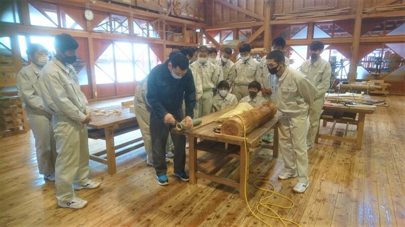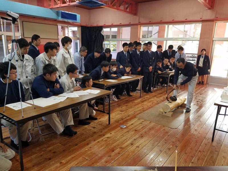 実演では釿(ちょうな)や槍鉋(やりかんな)を用いた木材の加工や、鳥居の制作に用いた各種道具の説明・披露を専攻科の生徒が中心となって行いました。