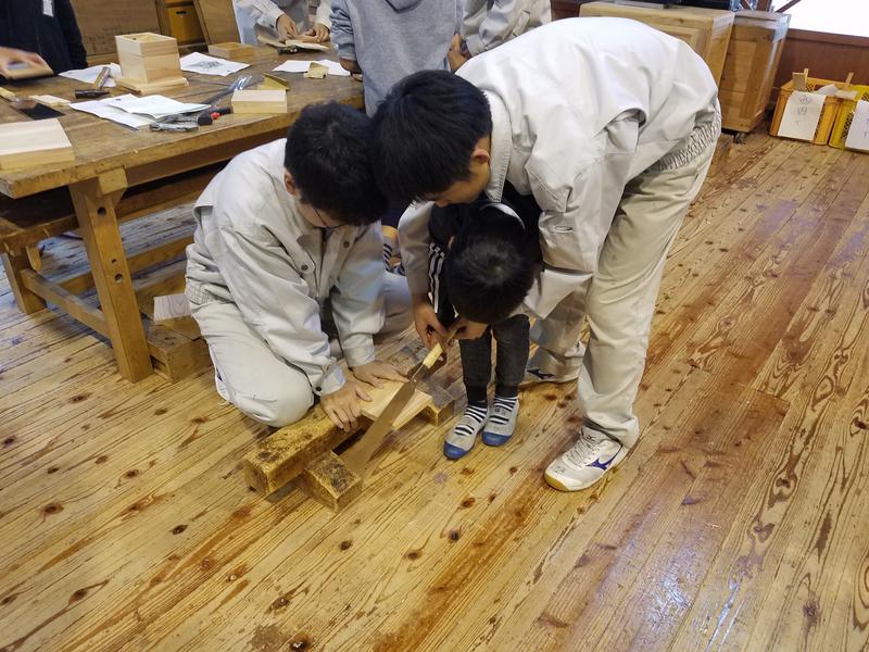 12月4日、月曜日に人吉西小学校4年1組の児童と本校建築科3年生で木工教室を開催しました。