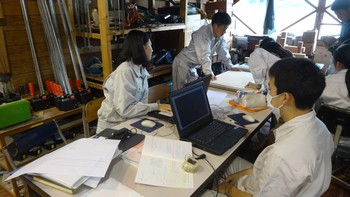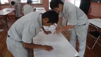左の写真はCADで修理後の図面を書いているところです。図面も生徒自身で描いていきます。今まで習った図面の書き方を思い出しながら分かりやすい図面を描けるようしっかり取り組んでいます。