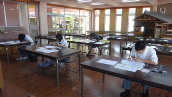 6月10日(土)にレタリング検定が本校で行われました。レタリングとは文字の字体やバランスなどを考慮して商業用にデザインすることです。検定では、知識問題と実技問題(フリーハンドによる字体表現・和文の書体表現・欧文の拡大視写)があり、実技問題ではコンパスや定規を駆使して文字をレタリングしていきます。