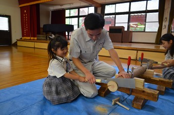 20日(水)の課題研究「木育班」では、学校の近くの青井幼稚園で第一回木育教室を開催しました。今回は、お箸づくりと丸太切り体験をしました。高校生8名、年長さん20名で楽しみながら木と触れ合いました(^^)/