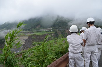 熊本復興事務所では、阿蘇の土砂災害の状況や整備計画などの説明をしていただきました。危険箇所の作業となるので、無人の重機を使用し、遠隔操作で作業をしていることにとても驚きました。その後、阿蘇大橋の崩落現場や土砂災害、長陽大橋が見える現場へ連れて行っていただきました。実際の現場を間近で見て、被害の大きさに衝撃を受けました。