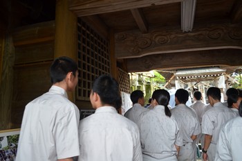 津森神宮では、本校から祠を寄贈する計画もあり、見学に行かせていただきました。倒壊は免れたものの、基礎と土台が大きくずれてしまっている楼門や簡易的に補強している拝殿などを見学しました。