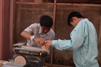 左の写真は高欄の模型を組み立てている様子です。材料が反っていたり、加工精度の問題などのため留めになる部分がなかなかきっちりいきません。難しいです。右の写真は栭束の加工を行っているところです。