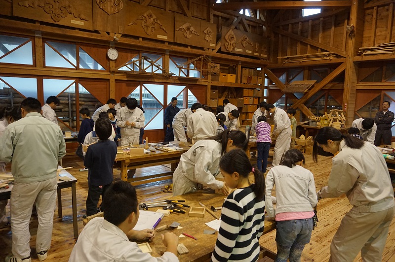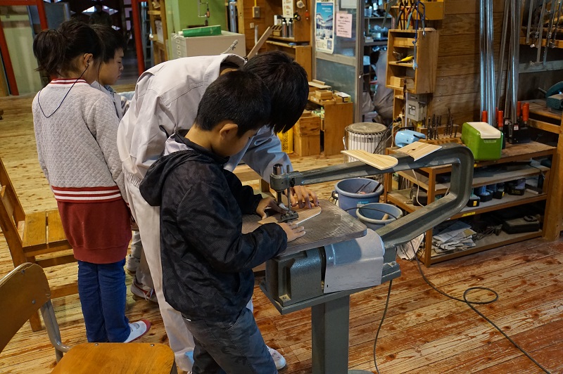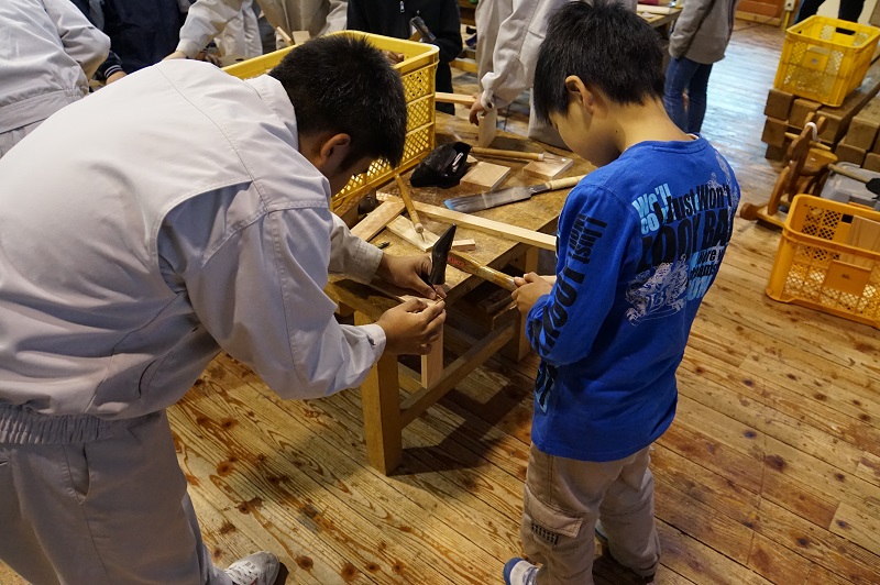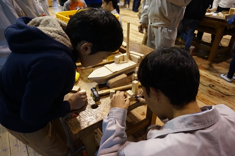 小学生の書いた作品を元に木工品の製作を行いました。日頃の授業で身につけた技術を活かして小学生と一緒に