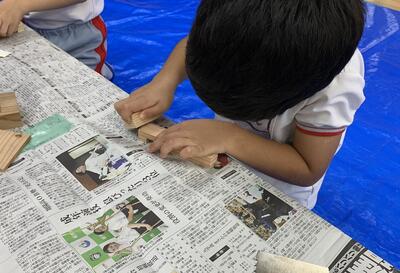 1日目は大きな木の板を丸くするためにのこぎりで木材を切り落としていきました。たくさん切ったので子ども達も「疲れた~」と言いながらも笑顔で頑張ってくれました。その他にも木材をやすりで磨いたり、ステンシル技法を使って卒園製作のプレートを作っていきました。