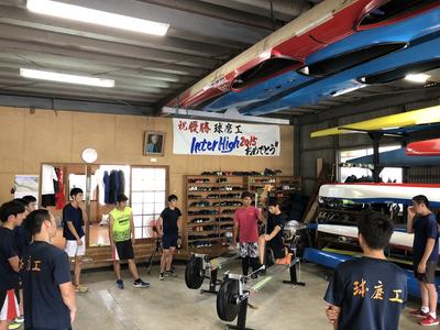 休校が開けて、まだ体力的に追いついていないという状況の中、部活が本格的に再開し始めました。さらには、時期的に天候も悪く、水上での練習が思うようにできず、陸上トレーニングが多くなっています。そのような中、OBの橋本さん(球磨工卒)、秋山さん(人高卒)が来てくださり、指導をしてくださいました。実際に実績を残した身近な先輩からの指導は、新鮮で身が入っているように感じました。