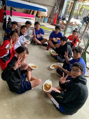 日曜日午前中の練習が終わった後、艇庫で保護者の方々がカレーの炊き出しをしてくださいました