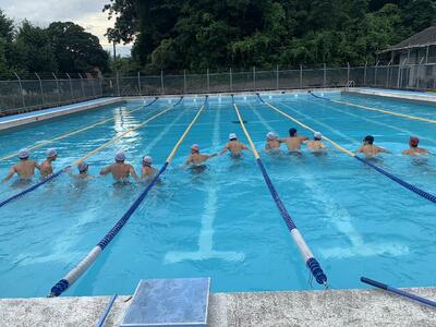 1学期最後の日(7月20日)の朝練は、いつも朝練で使わせて頂いているプールのコケ取りをしましたただ歩いているように見えますが、プールの床に生えてしまった苔を足の裏で取っています。皆で手を繋いで、楽しそうにしてくれました