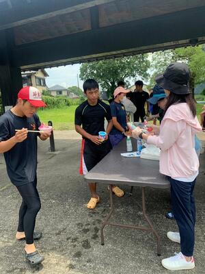 夏休み入って初めの土曜日(7月22日)、後援会の皆さんがかき氷を差し入れしてくださいましたかき氷器でその場で作ってくださったかき氷は、暑い中練習をした火照った体には絶品でした!この笑顔です