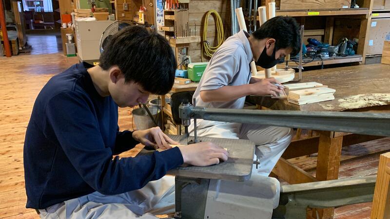 新入部員は毎年恒例の木の皮を剥ぐ作業を終え、早速、作品作りに取りかかっています。慣れない機械の作業や初めての作品作りにあたふたしながらも楽しみながら制作しています。