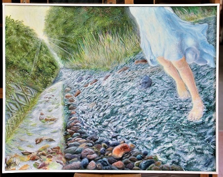 秋の美術展に向けて大きなキャンバスにどんどん絵の具をのせています。