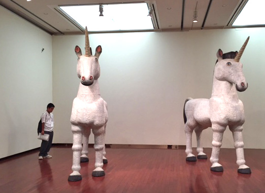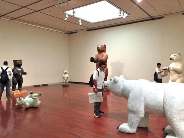 熊本市現代美術館では彫刻家三沢厚彦さんの「ANIMALS」。主に動物をモチーフにして制作されている作家です。作品は樟(くすのき)を使用してあるので、会場に足を入れると樟の香りをほのかに感じられ、目で見るだけではなく身体全体で感じる展覧会でした。