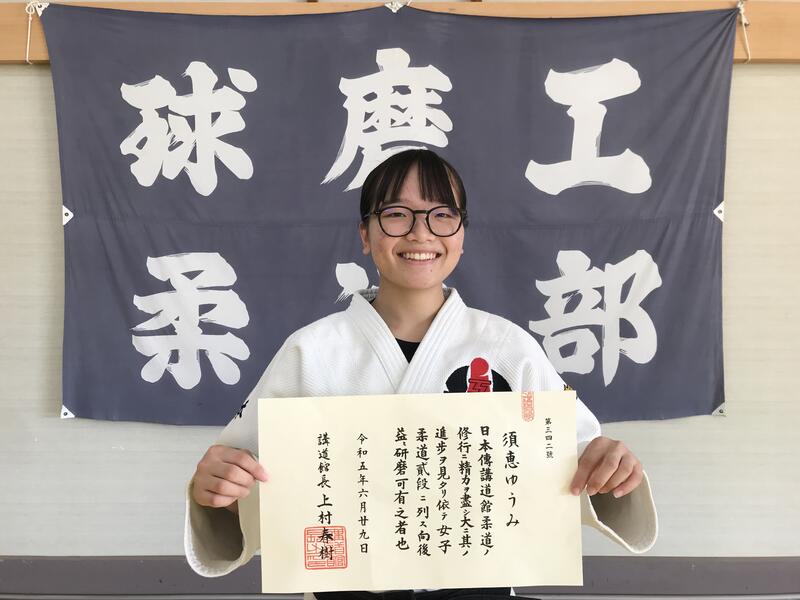 令和5年熊本県春季昇段審査において、柔道二段に須恵ゆうみさん(2年建設工学科、人吉二中出身)が合格、昇段しました!おめでとうございます!!