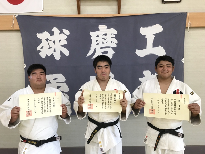 令和5年熊本県夏季昇段審査において、柔道二段に橋口朋弥さん(3年電気科、あさぎり中出身、写真中央)、青木蓮樹さん(2年機械科、人吉二中出身、写真左)、東幸生さん(2年機械科、錦中出身、写真右)の3名が合格、昇段しました!おめでとうございます!!