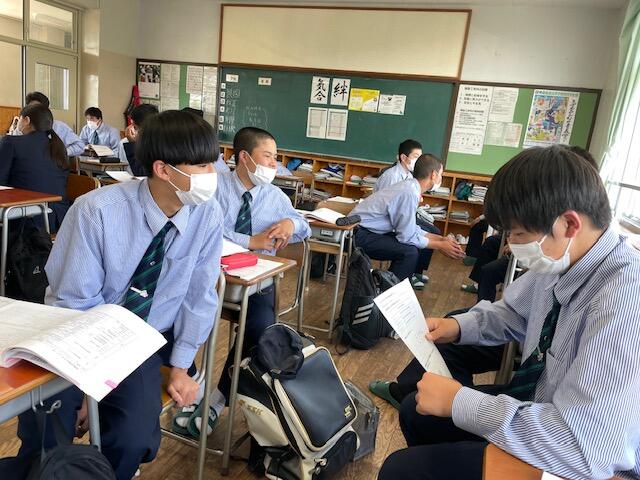 3年生の登校日。貴重な時間を使って、進路決定までの体験談やアドバイスを後輩達へ語る「進路トーク」が実施されました。進路決定までのプロセス、選択理由、勉強の仕方や採用試験でのポイントなどを、自作の資料を参照しながら伝えてくれる姿は、先輩として最後の役目を果たそうとしているようにも見えました。後輩達は熱心にメモを取りながら、質問も飛び交っていました。今年もコロナ禍の中、卒業式まであと2週間です。