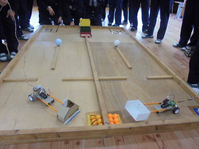 2月27日(月)に、第23回電気科1年ロボット競技大会を開催しました。参加生徒は39名で、19台のロボットで予選を行い、勝ち上がった上位8台のロボットが決勝トーナメントに進み、優勝したロボットは担任が操縦するロボットに挑戦することができます。それぞれ工夫した手作りのロボットを、ナビゲータ(指示及び配線の管理)とオペレータ(操縦者)の二人一組で対戦します。