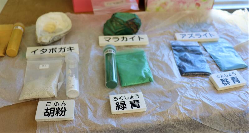 天然の土や鉱石などを砕いて粉末状にした顔料(絵の具の元)の現物を展示していただきました。