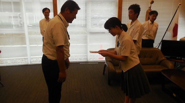 10月12日(水)に本校の校長室において、奨励金の授与式が行われました。授与されるのは、11月5日(土)・6日(日)に石川県金沢市で行われる「第24回全国高等学校ロボット競技大会」に出場する溶接部ロボット班(18名)と、10月23日(日)~29日(土)にアメリカのミシガン州にある平田機工(熊本市植木町)のニューハドソン工場で「専門高校生による海外インターンシップ事業」に熊本県の工業高校から10名が参加します。その10名に選ばれました、電気科2年園田万帆さんに、奨励金が和田会長より渡されました。