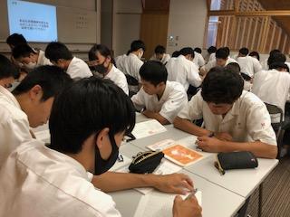 前半では本田技研工業(株)から若林政人様をお招きして、就職活動に向けての心構えや自動車産業を取り巻く環境などについて講演をしていただきました。「能ある鷹は爪を出せ」「どうなるかじゃない、どうするかだ」といった企業理念に基づく熱いメッセージに、生徒たちは大変刺激を受けていたようでした。