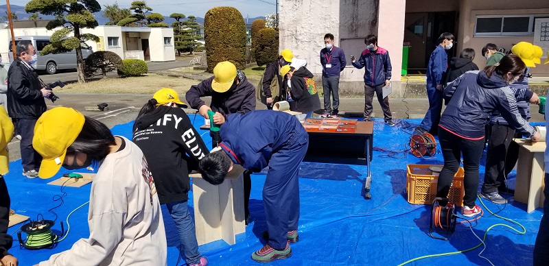今回「技術ボランティア」として参加したのは、電気科2年のあさぎり中出身の7名と職員1名の8名で、ほとんどの子ども達が初めて電気ドリルを手にしました。ドリルの刃の付け方や丸い竹に穴を開ける方法などを説明した後、作業に取りかかりました。