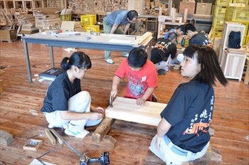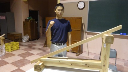 アミアミ椅子,折りたたみテーブル,縁台の中から一つ選択していただき、本校建築科の生徒とペアで作業します。みんな楽しそうに、一生懸命作業をして全員完成することができました‼