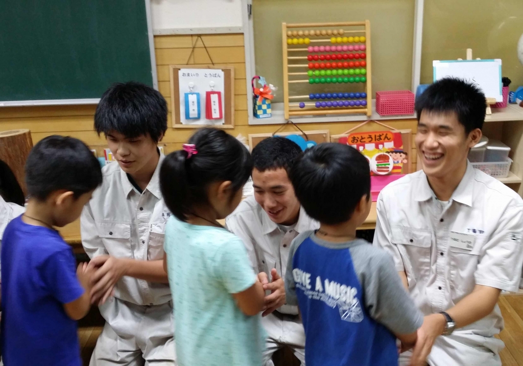 7月6日(水)と13日(水)の午後から建築科3年生の授業「課題研究」の木育班(7名)で学校の近くの青井幼稚園と人吉中央幼稚園へ行きました。木育班では、木について学ぶと共に地域との交流を通して保育の分野についても学んでいます。