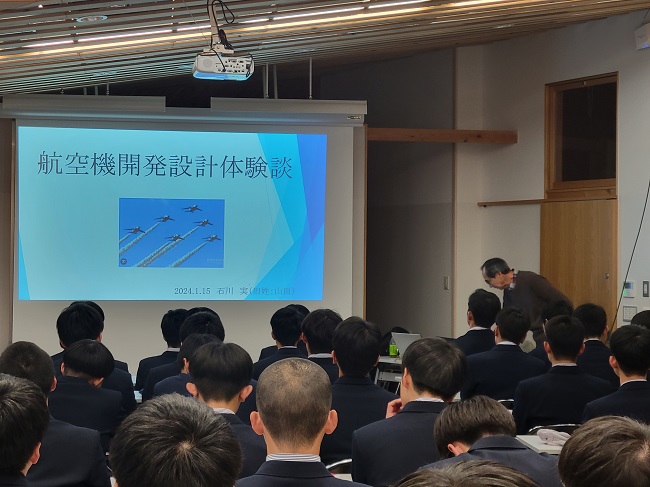 1月15日(月)の5限目に機械科2年生(71名)を対象に、本校大会議室において、進路講話が実施されました。講師は、本校の機械科4期生の石川実氏(旧姓:山田、野球部、神瀬中学校出身)です。