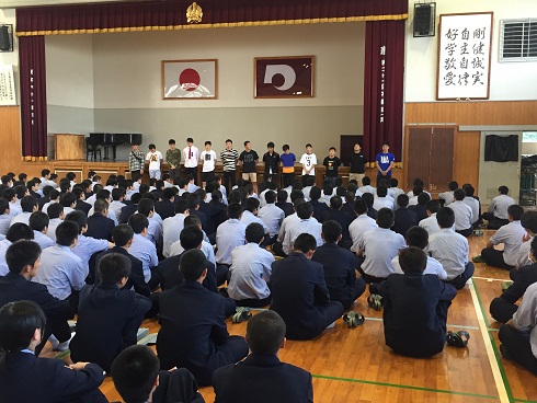 5月1日(金)に本校の体育館で今年の3月に卒業した機械科OBの16名が後輩のために近況報告をしに来ました。