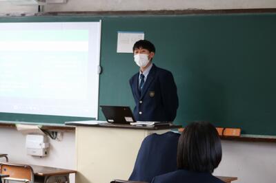 3年生の登校日。貴重な時間を使って、進路決定までの体験談やアドバイスを後輩達へ語る「進路トーク」が実施されました。進路決定までのプロセス、選択理由、勉強の仕方や採用試験でのポイントなどを、自作の資料を参照しながら伝えてくれる姿は、先輩として最後の役目を果たそうとしているようにも見えました。後輩達は熱心にメモを取りながら、質問も飛び交っていました。今年もコロナ禍の中、卒業式まであと2週間です。