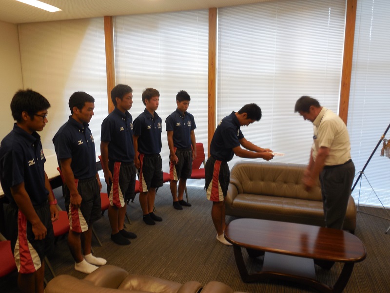 授与式では、全国大会に出場する8名を代表し、主将の北崎君(多良木中出身)が決意表明をした後、中村春喜副会長(建築科11期生)より、激励の言葉をいただき奨励金が授与されました。