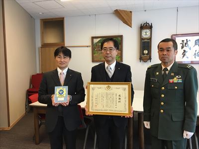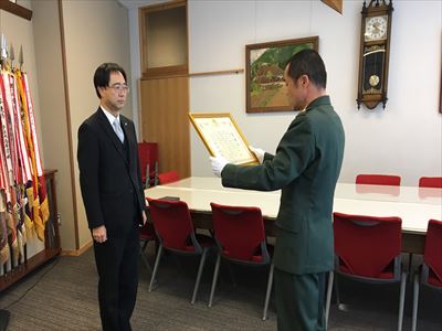 自衛隊熊本地方協力本部から、自衛官採用に関する本校の進路指導の功績に対して感謝状をいただきました。本日、本校校長室にて授与式が執り行われ、自衛隊人吉地域事務所所長、吉村寿喜様から校長に感謝状と盾が手渡されました。