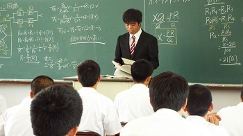 6月11日(月)~22日(金)の2週間、崇城大学4年の板﨑君(H26年卒、人吉二中出身、電子工作部)が教員を目指すということで、教育実習を行ないました。早いもので本日が最終日となり、電気科1年の5限目の電気基礎の時間に「ブリッジ回路」の研究授業の発表が行なわれました。板書をする板﨑君 真面目に授業を受ける生徒達