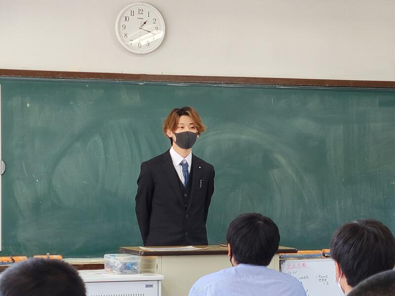 5/2(月)の5限目の授業に、令和2年度に卒業した『林 大輝』君が来校し、電気科3年生に対して、進路講話をしてくれました。