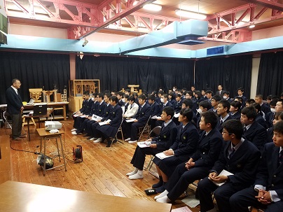 2011年3月11日東日本大震災の津波の被災にあった福島県南相馬市の山田神社に2012年2月26日に本校で制作した祠や鳥居、灯籠を支援物資等と共に奉納しました。そのあと、その復興支援をきっかけに日本財団が山田神社の社殿を新築してくれました。そのおかげで、また農業を再開する気持ちが高まり、現在、八沢浦の農地が7割が作付されるようになったと伺いました。そのことに対する感謝のために宮司の森さんと氏子の皆さんが来校されました。