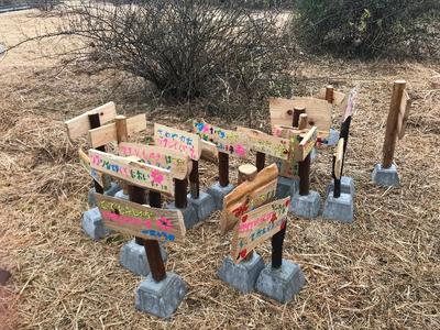 私たち木工班が製作した立て札に、地元小学校の生徒達がとても可愛く文字や絵を描いて温もりのある立て札が完成しました。5~6月になると、ツクシイバラが咲き美しい景色となりますので、是非、足を運んで下さい。