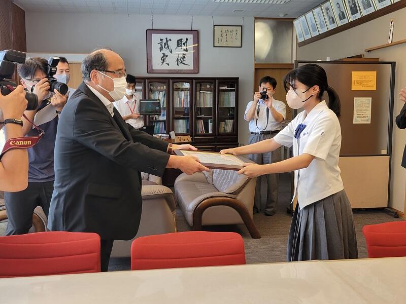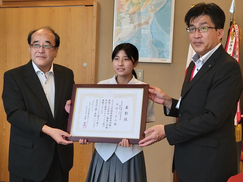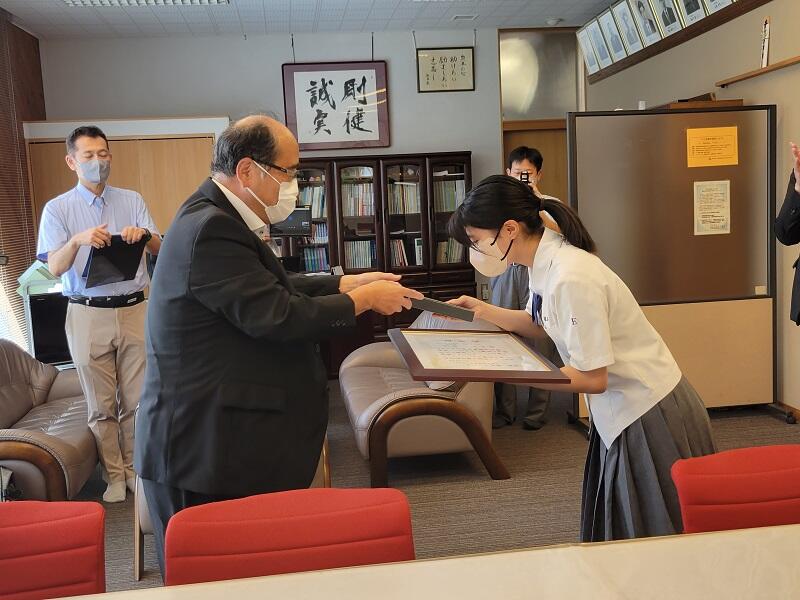 令和4年8月1日(月)午前10時より本校校長室において、甲種の危険物取扱者取得者の表彰式が行われました。見事難関資格に合格したのは、『電気科3年中村くるみ』さん(あさぎり中出身)です。