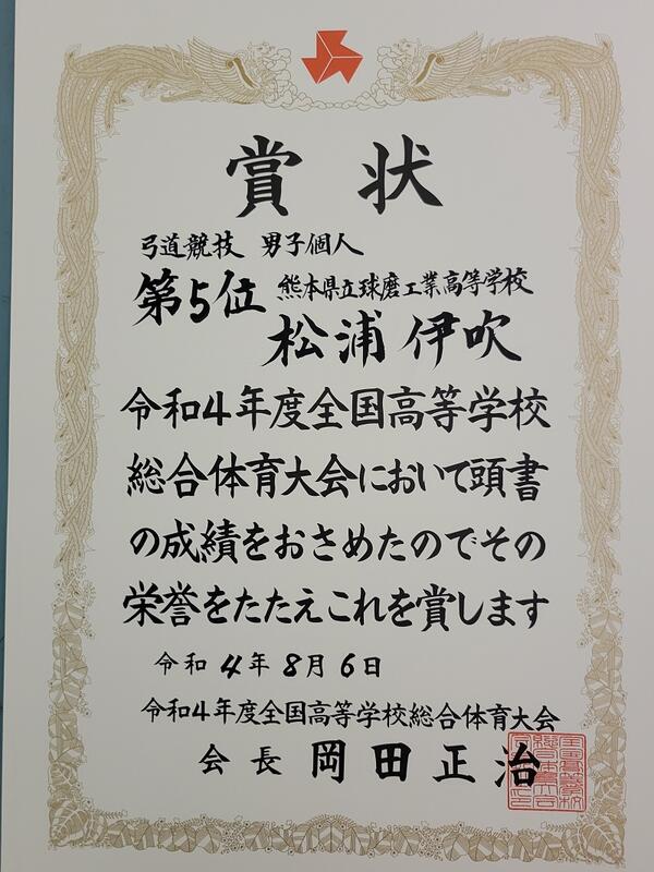 インターハイ・5位の弓道部の松浦君(3年建築科)