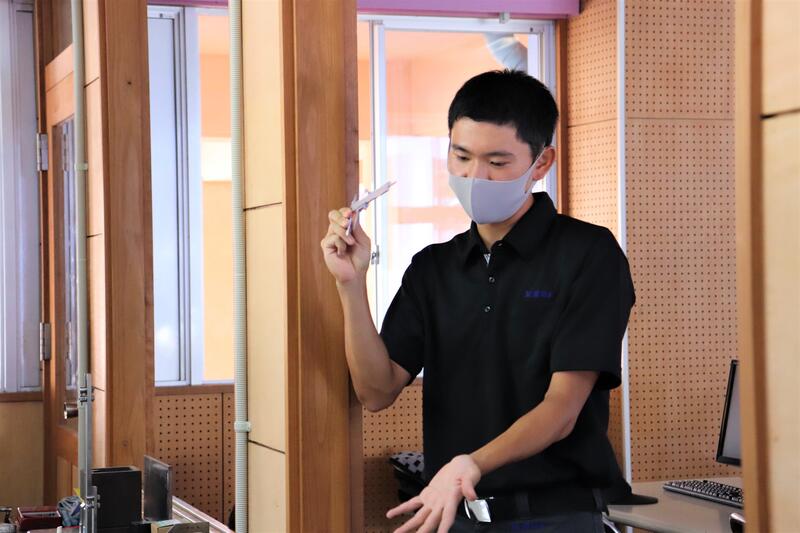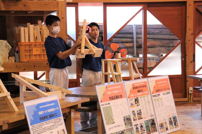 実習作品の紹介。見せているのは若年者ものづくり大会で敢闘賞に輝いた作品です。