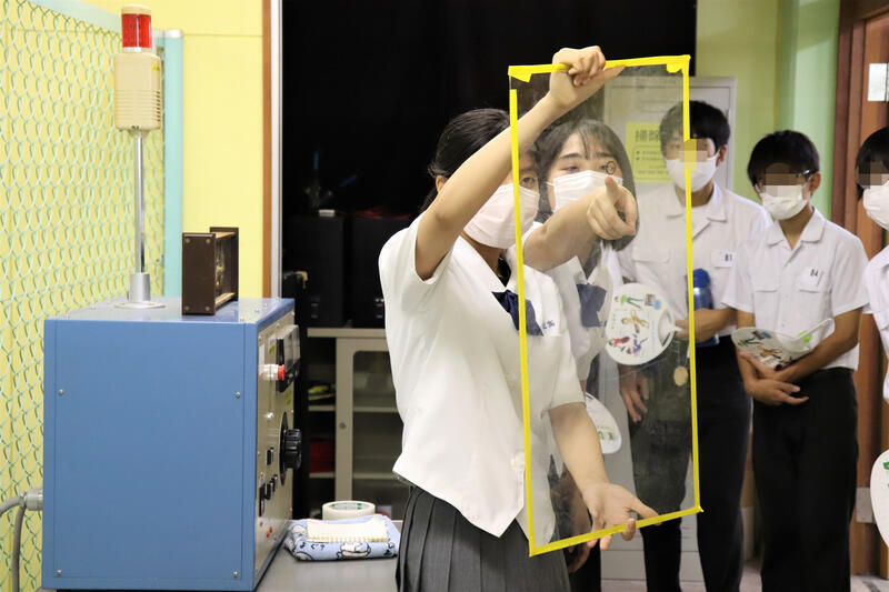 コロナ放電の実践。目に見える電気に驚いたことでしょう。ガラスの板に残った跡に衝撃!!?