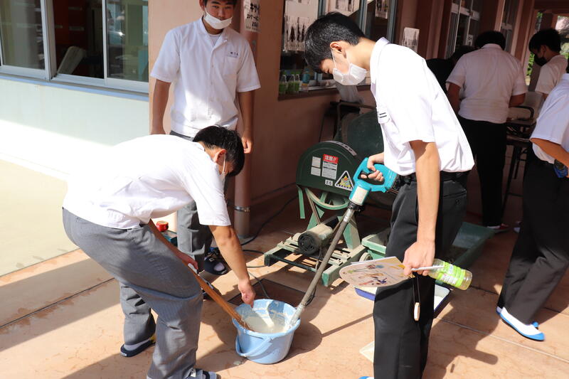 セメントを作る際、中に入っている空気をどうやって抜くのかを体験しています。