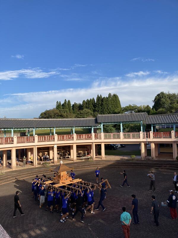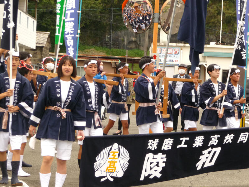 神幸行列では神輿の他にも、カヌー部の生徒が神具を持つ役目、獅子守の役目を務めていました。