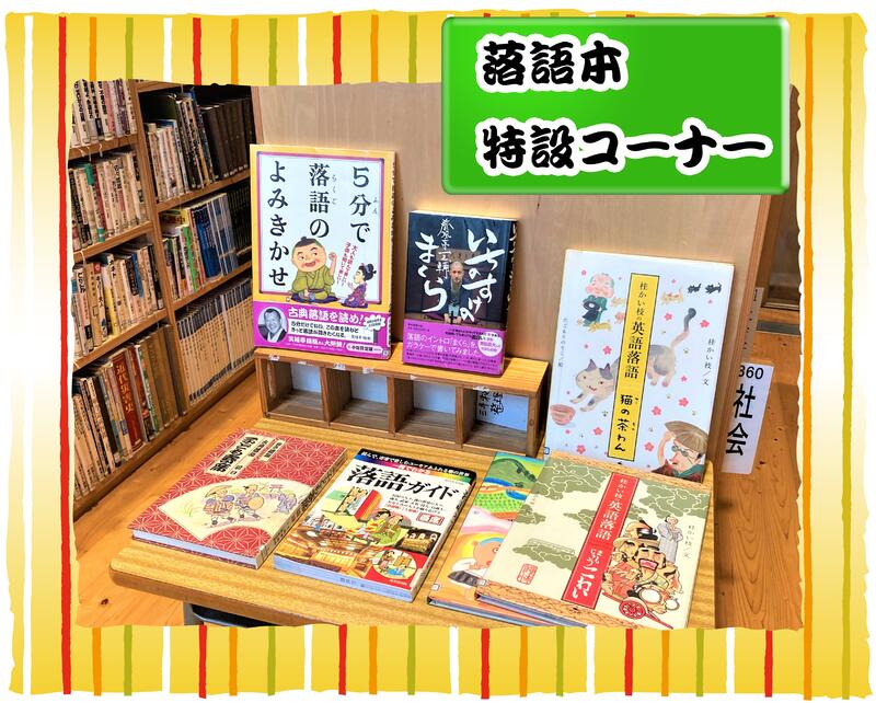 落語本の特設コーナーをつくりました図書館の中央あたりにあります。